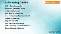 The warm glow of a single candle flame <br />beckons a weary stranger there <br />to the bosom of a warm fire in <br />from the nighttime's cold. <br />A warm caring heart keeps the candle lit <br />to welcome back their love <br />from their long and lonely trek. <br />Each night they light the candle, <br />and sit waiting all alone, <br />hoping one night their love, <br />will glance on it <br />and return to their loving home. <br />The warm stretching finger <br />prods the darkness every night, <br />as it can be seen from miles away <br />across the empty prairie, <br />as they sit alone each night <br />by the warm fair light. <br />Hoping that their love will see its warm glow <br />and return to it and come home tonight <br />from their long and weary trek. <br />For years, the candle was lit, <br />but sadly, it shines no more. <br />Love broke the lonely heart <br />when they never came home. <br />Now all you can hear is a lonesome whistle <br />when the wind blows cold at night. <br />It has replaced that warm glow <br />of that single candle light.<br /><br />David Harris<br /><br />http://www.poemhunter.com/poem/single-candle-light/