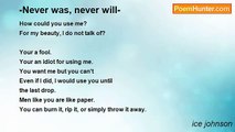 Last night <br />{Copyright © 2009 by Ice} <br />Last time I can remember <br />I took the keys to this place <br />I took all my stuff <br /> <br />I lit a match and burned our house. <br />To ashes, into something I am displeased from <br />You ran to me. <br />In detail, your hair blew with the wind. <br />You took off your sunglasses <br />You spoke of words I erased from my hearing <br />Slowly your lips spoke <br />Not a minute did I waste kissing you. <br /> <br />I didn't care if you were taken <br />{Copyright © 2009 by Ice} <br />I didn't care if you didn't like me <br />You had to know. I was going to love you <br />I was ready for forever. Too bad it was cut short <br />of foolish decisions. <br /> <br />Now you know that I loved you. <br />{Copyright © 2009 by Ice}<br /><br />ice johnson<br /><br />http://www.poemhunter.com/poem/burning-what-was/