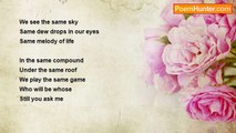 One day I will fall down like the cloud <br />No one will be there to see me <br />No one will be there to hear me <br /> <br />Sky will be there where it is <br />Stars will be there where they are <br /> <br />No one will come with me <br /> <br />Not even you <br /> <br />There will be no blues in my eyes <br />There will be no blood in my heart <br /> <br />Lips that carry the music <br />Fingers that feel the wave will freeze <br /> <br />Oh my lonely flute will you play for me <br />That I can sleep <br /> <br />Where I will be <br />Where will be you <br /> <br />Yes but I know <br />i will not able to swim in the ocean of your eyes <br />Not able to sit in the room of your heart <br />Not able to hide myself in the darkness of your hair <br />No not, I am not able to sit with you for a dinner <br /> <br />Don't know where I will be <br />But I know <br />What I am I will not be <br />My myself no more maintain my identity.<br /><br />Raju Baruah<br /><br />http://www.poemhunter.com/poem/don-t-know-where-i-will-be/