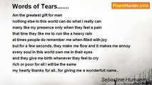 Tears are words <br />They have a story to tell <br />From a shattered heart <br />Who knows the story well. <br />Whose scars still show. <br />Pieced back together <br />By fond memories <br />Agony still exists <br />Like an enemy<br /><br />Cory Jensen<br /><br />http://www.poemhunter.com/poem/tears-are-words/