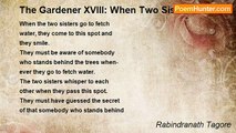 WHEN the two sisters go to fetch water, they come to this spot and they smile. <br />They must be aware of somebody who stands behind the trees whenever they go to fetch water. <br /> <br />The two sisters whisper to each other when they pass this spot. <br />They must have guessed the secret of that somebody who stands behind the trees whenever they go to fetch water. <br /> <br />Their pitchers lurch suddenly, and water spills when they reach this spot. <br />They must have found out that somebody's heart is beating who stands behind the trees whenever they go to fetch water. <br /> <br />The two sisters glance at each other when they come to this spot, and they smile. <br />There is a laughter in their swift-stepping feet, which makes confusion in somebody's mind who stands behind the trees whenever they go to fetch water.<br /><br />Rabindranath Tagore<br /><br />http://www.poemhunter.com/poem/when-the-two-sisters-go-to-fetch-water/
