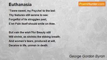 When Time, or soon or late, shall bring <br />The dreamless sleep that lulls the dead, <br />Oblivion! may thy languid wing <br />Wave gently o'er my dying bed! <br /> <br />No band of friends or heirs be there, <br />To weep, or wish, the coming blow: <br />No maiden, with dishevelled hair, <br />To feel, or feign, decorous woe. <br /> <br />But silent let me sink to earth, <br />With no officious mourners near: <br />I would not mar one hour of mirth, <br />Nor startle friendship with a tear. <br /> <br />Yet Love, if Love in such an hour <br />Could nobly check its useless sighs, <br />Might then exert its latest power <br />In her who lives, and him who dies. <br /> <br />'Twere sweet, my Psyche! to the last <br />Thy features still serene to see: <br />Forgetful of its struggles past, <br />E’en Pain itself should smile on thee. <br /> <br />But vain the wish?for Beauty still <br />Will shrink, as shrinks the ebbing breath; <br />And women's tears, produced at will, <br />Deceive in life, unman in death. <br /> <br />Then lonely be my latest hour, <br />Without regret, without a groan; <br />For thousands Death hath ceas’d to lower, <br />And pain been transient or unknown. <br /> <br />'Ay, but to die, and go,' alas! <br />Where all have gone, and all must go! <br />To be the nothing that I was <br />Ere born to life and living woe! <br /> <br />Count o'er the joys thine hours have seen, <br />Count o'er thy days from anguish free, <br />And know, whatever thou hast been, <br />'Tis something better not to be.<br /><br />George Gordon Byron<br /><br />http://www.poemhunter.com/poem/euthanasia-9/