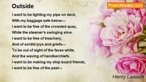 There were ten of us there on the moonlit quay, <br />And one on the for’ard hatch; <br />No straighter mate to his mates than he <br />Had ever said: ‘Len’s a match!’ <br />'’Twill be long, old man, ere our glasses clink, <br />’Twill be long ere we grip your hand!'— <br />And we dragged him ashore for a final drink <br />Till the whole wide world seemed grand. <br />For they marry and go as the world rolls back, <br />They marry and vanish and die; <br />But their spirit shall live on the Outside Track <br />As long as the years go by. <br /> <br />The port-lights glowed in the morning mist <br />That rolled from the waters green; <br />And over the railing we grasped his fist <br />As the dark tide came between. <br />We cheered the captain and cheered the crew, <br />And our mate, times out of mind; <br />We cheered the land he was going to <br />And the land he had left behind. <br /> <br />We roared Lang Syne as a last farewell, <br />But my heart seemed out of joint; <br />I well remember the hush that fell <br />When the steamer had passed the point <br />We drifted home through the public bars, <br />We were ten times less by one <br />Who sailed out under the morning stars, <br />And under the rising sun. <br /> <br />And one by one, and two by two, <br />They have sailed from the wharf since then; <br />I have said good-bye to the last I knew, <br />The last of the careless men. <br />And I can’t but think that the times we had <br />Were the best times after all, <br />As I turn aside with a lonely glass <br />And drink to the bar-room wall. <br /> <br />But I’ll try my luck for a cheque Out Back, <br />Then a last good-bye to the bush; <br />For my heart’s away on the Outside Track, <br />On the track of the steerage push.<br /><br />Henry Lawson<br /><br />http://www.poemhunter.com/poem/the-outside-track/