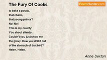I would like to bury <br />all the hating eyes <br />under the sand somewhere off <br />the North Atlantic and suffocate <br />them with the awful sand <br />and put all their colors to sleep <br />in that soft smother. <br />Take the brown eyes of my father, <br />those gun shots, those mean muds. <br />Bury them. <br />Take the blue eyes of my mother, <br />naked as the sea, <br />waiting to pull you down <br />where there is no air, no God. <br />Bury them. <br />Take the black eyes of my love, <br />coal eyes like a cruel hog, <br />wanting to whip you and laugh. <br />Bury them. <br />Take the hating eyes of martyrs, <br />presidents, bus collectors, <br />bank managers, soldiers. <br />Bury them. <br />Take my eyes, half blind <br />and falling into the air. <br />Bury them. <br />Take your eyes. <br />I come to the center, <br />where a shark looks up at death <br />and thinks of my heart <br />and squeeze it like a doughnut. <br />They'd like to take my eyes <br />and poke a hatpin through <br />their pupils. Not just to bury <br />but to stab. As for your eyes, <br />I fold up in front of them <br />in a baby ball and you send <br />them to the State Asylum. <br />Look! Look! Both those <br />mice are watching you <br />from behind the kind bars.<br /><br />Anne Sexton<br /><br />http://www.poemhunter.com/poem/the-fury-of-hating-eyes/