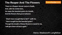 There is a Reaper whose name is Death, <br />And, with his sickle keen, <br />He reaps the bearded grain at a breath, <br />And the flowers that grow between. <br /> <br />'Shall I have nought that is fair?' saith he; <br />'Have nought but the bearded grain? <br />Though the breath of these flowers is sweet to me, <br />I will give them all back again.' <br /> <br />He gazed at the flowers with tearful eyes, <br />He kissed their drooping leaves; <br />It was for the Lord of Paradise <br />He bound them in his sheaves. <br /> <br />'My Lord has need of these flowerets gay,' <br />The Reaper said, and smiled; <br />'Dear tokens of the earth are they, <br />Where he was once a child. <br /> <br />'They shall all bloom in fields of light, <br />Transplanted by my care, <br />And saints, upon their garments white, <br />These sacred blossoms wear.' <br /> <br />And the mother gave, in tears and pain, <br />The flowers she most did love; <br />She knew she should find them all again <br />In the fields of light above. <br /> <br />O, not in cruelty, not in wrath, <br />The Reaper came that day; <br />'Twas an angel visited the green earth, <br />And took the flowers away.<br /><br />Henry Wadsworth Longfellow<br /><br />http://www.poemhunter.com/poem/voices-of-the-night-the-reaper-and-the-flowers/