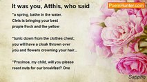Fragments 33, 57A, 44, 41, 70, 58 combined. <br /> <br />I loved thee, Atthis, — even thee! — <br /> <br />Ah, long ago! <br />As Aphrodite's handmaid bright <br />As gold wert thou then in my sight. <br />A very queen of love to me <br /> <br />Then didst thou show. <br />Fair gifts I sent thee — 'broidery <br />Of golden thread whose shimmering light <br />Flashed mid the purple on thy knee, <br /> <br />A gleam and glow. <br />Then I knew not thine heart aright: <br /> <br />But now I know! <br />Thou incarnate false inconstancy — <br /> <br />To whom I grow <br />A thing to hate! — thou takest flight <br />On wings of love to — who is she? <br />A rustic wench whose garments flow <br />About her heels ungracefully! <br /> <br />O yea, let thy false love requite <br />Andromeda's worship! Take delight <br />In her — thou who from my love's height <br />Hast sunk so low!<br /><br />Sappho<br /><br />http://www.poemhunter.com/poem/to-atthis-the-inconstant/