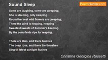 Sleeping at last, the trouble and tumult over, <br />Sleeping at last, the struggle and horror past, <br />Cold and white, out of sight of friend and of lover, <br />Sleeping at last. <br /> <br />No more a tired heart downcast or overcast, <br />No more pangs that wring or shifting fears that hover, <br />Sleeping at last in a dreamless sleep locked fast. <br /> <br />Fast asleep. Singing birds in their leafy cover <br />Cannot wake her, nor shake her the gusty blast. <br />Under the purple thyme and the purple clover <br />Sleeping at last.<br /><br />Christina Georgina Rossetti<br /><br />http://www.poemhunter.com/poem/sleeping-at-last-2/
