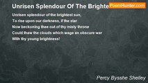 Offspring of Jove, Calliope, once more <br />To the bright Sun, thy hymn of music pour; <br />Whom to the child of star-clad Heaven and Earth <br />Euryphaessa, large-eyed nymph, brought forth; <br />Euryphaessa, the famed sister fair <br />Of great Hyperion, who to him did bear <br />A race of loveliest children; the young Morn, <br />Whose arms are like twin roses newly born, <br />The fair-haired Moon, and the immortal Sun, <br />Who borne by heavenly steeds his race doth run <br />Unconquerably, illuming the abodes <br />Of mortal Men and the eternal Gods. <br /> <br />Fiercely look forth his awe-inspiring eyes, <br />Beneath his golden helmet, whence arise <br />And are shot forth afar, clear beams of light; <br />His countenance, with radiant glory bright, <br />Beneath his graceful locks far shines around, <br />And the light vest with which his limbs are bound, <br />Of woof aethereal delicately twined, <br />Glows in the stream of the uplifting wind. <br />His rapid steeds soon bear him to the West; <br />Where their steep flight his hands divine arrest, <br />And the fleet car with yoke of gold, which he <br />Sends from bright Heaven beneath the shadowy sea.<br /><br />Percy Bysshe Shelley<br /><br />http://www.poemhunter.com/poem/homer-s-hymn-to-the-sun/