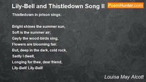 'Bright shines the summer sun, <br />Soft is the summer air; <br />Gayly the wood-birds sing, <br />Flowers are blooming fair. <br /> <br />'But, deep in the dark, cold rock, <br />Sadly I dwell, <br />Longing for thee, dear friend, <br />Lily-Bell! Lily-Bell!' <br /> <br />'Through sunlight and summer air <br />I have sought for thee long, <br />Guided by birds and flowers, <br />And now by thy song. <br /> <br />'Thistledown! Thistledown! <br />O'er hill and dell <br />Hither to comfort thee <br />Comes Lily-Bell.'<br /><br />Louisa May Alcott<br /><br />http://www.poemhunter.com/poem/lily-bell/