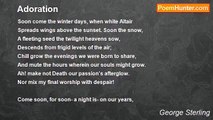 Like some regret that, half-forgot, <br />Gropes into memory, <br />Here in a shadow-chosen spot <br />Thy music steals to me. <br /> <br />To soft for joy, too mild for grief, <br />Within the wood it dies— <br />Beauty too wayward and too brief <br />To grace our noonday skies. <br /> <br />The dusk enfolds me, and the year <br />Stands at the western gate. <br />Thy song, the symbol of a tear, <br />Echoes the cry 'Too late!' <br /> <br />'Too late!' cries back the conscious heart, <br />As one that in dismay <br />Had seen the affronted gods depart <br />And could not bid them stay; <br /> <br />Nor could retain from Time's control <br />A moment or a flow'r, <br />Save when in woodlands of the soul <br />Such strains endure an hour.<br /><br />George Sterling<br /><br />http://www.poemhunter.com/poem/an-autumn-thrush/