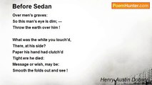Another battle! and the sounds have rolled <br />By many a gloomy gorge and wasted plain <br />O’er huddled hills and mountains manifold, <br />Like winds that run before a heavy rain <br />When Autumn lops the leaves and drooping grain, <br />And earth lies deep in brown and cloudy gold. <br />My brothers, lo! our grand old England stands, <br />With weapons gleaming in her ready hands, <br />Outside the tumult! Let us watch and trust <br />That she will never darken in the dust <br />And drift of wild contention, but remain <br />The hope and stay of many troubled lands, <br />Where so she waits the issue of the fight, <br />Aloof; but praying “God defend the Right!”<br /><br />Henry Kendall<br /><br />http://www.poemhunter.com/poem/sedan/