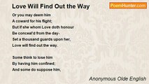 Alone walking, In thought pleyning, <br />And sore sighing, All desolate, <br />Me remembring Of my living, <br />My deth wishing Bothe erly and late. <br /> <br />Infortunate Is so my fate <br />That, wote ye what? Out of mesure <br />My lyf I hate Thus desperate; <br />In pore estate Do I endure. <br /> <br />Of other cure Am I nat sure, <br />Thus to endure Is hard, certain; <br />Such is my ure, I yow ensure; <br />What creature May have more pain? <br /> <br />My trouth so pleyn Is take in veyn, <br />And gret disdeyn In remembraunce; <br />Yet I full feyn Wold me compleyn <br />Me to absteyn From this penaunce. <br /> <br />But in substaunce Noon allegeaunce <br />Of my grevaunce Can I nat finde; <br />Right so my chaunce With displesaunce <br />Doth me avaunce; And thus an ende. <br /> <br />Explicit<br /><br />Anonymous Olde English<br /><br />http://www.poemhunter.com/poem/virelal/