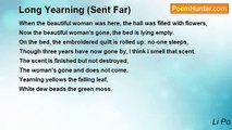Misted the flowers weep as light dies <br />Moon of white silk sleeplessly cries. <br />Stilled - Phoenix wings. <br />Touched - Mandarin strings. <br /> <br />This song tells secrets that no one knows <br />To far Yenjan on Spring breeze it goes. <br />To you it flies <br />Through the night skies. <br /> <br />Sidelong - Eyes. How <br />White tears fill now! <br />Heart’s pain? Come see - <br />In this mirror with me.<br /><br />Li Po<br /><br />http://www.poemhunter.com/poem/yearning-10/