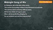 A slip of the moon hangs over the capital; <br />Ten thousand washing-mallets are pounding; <br />And the autumn wind is blowing my heart <br />For ever and ever toward the Jade Pass.... <br />Oh, when will the Tartar troops be conquered, <br />And my husband come back from the long campaign!<br /><br />Li Po<br /><br />http://www.poemhunter.com/poem/a-song-of-an-autumn-midnight/