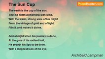 The earth is the cup of the sun, <br />That he filleth at morning with wine, <br />With the warm, strong wine of his might <br />From the vintage of gold and of light, <br />Fills it, and makes it divine. <br /> <br />And at night when his journey is done, <br />At the gate of his radiant hall, <br />He setteth his lips to the brim, <br />With a long last look of his eye, <br />And lifts it and draineth it dry, <br />Drains till he leaveth it all <br />Empty and hollow and dim. <br /> <br />And then, as he passes to sleep, <br />Still full of the feats that he did, <br />Long ago in Olympian wars, <br />He closes it down with the sweep <br />Of its slow-turning luminous lid, <br />Its cover of darkness and stars, <br />Wrought once by Hephaestus of old <br />With violet and vastness and gold.<br /><br />Archibald Lampman<br /><br />http://www.poemhunter.com/poem/the-sun-cup/