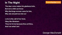 O wild and dark! a night hath found me now <br />Wherein I mingle with that element <br />Sent madly loose through the wide staring rent <br />In yon tormented branches! I will bow <br />A while unto the storm, and thenceforth grow <br />Into a mighty patience strongly bent <br />Before the unconquering Power which hither sent <br />These winds to fight their battles on my brow!- <br />Again the loud boughs thunder! and the din <br />Licks up my footfall from the hissing earth! <br />But I have found a mighty peace within, <br />And I have risen into a home of mirth! <br />Wildly I climb above the shaking spires, <br />Above the sobbing clouds, up through the steady fires!<br /><br />George MacDonald<br /><br />http://www.poemhunter.com/poem/written-on-a-stormy-night/