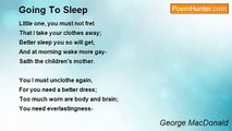 Oh! is it Death that comes <br />To have a foretaste of the whole? <br />To-night the planets and the stars <br />Will glimmer through my window-bars <br />But will not shine upon my soul! <br /> <br />For I shall lie as dead <br />Though yet I am above the ground; <br />All passionless, with scarce a breath, <br />With hands of rest and eyes of death, <br />I shall be carried swiftly round. <br /> <br />Or if my life should break <br />The idle night with doubtful gleams, <br />Through mossy arches will I go, <br />Through arches ruinous and low, <br />And chase the true and false in dreams. <br /> <br />Why should I fall asleep? <br />When I am still upon my bed <br />The moon will shine, the winds will rise <br />And all around and through the skies <br />The light clouds travel o'er my head! <br /> <br />O busy, busy things, <br />Ye mock me with your ceaseless life! <br />For all the hidden springs will flow <br />And all the blades of grass will grow <br />When I have neither peace nor strife. <br /> <br />And all the long night through <br />The restless streams will hurry by; <br />And round the lands, with endless roar, <br />The white waves fall upon the shore, <br />And bit by bit devour the dry. <br /> <br />Even thus, but silently, <br />Eternity, thy tide shall flow, <br />And side by side with every star <br />Thy long-drawn swell shall bear me far, <br />An idle boat with none to row. <br /> <br />My senses fail with sleep; <br />My heart beats thick; the night is noon; <br />And faintly through its misty folds <br />I hear a drowsy clock that holds <br />Its converse with the waning moon. <br /> <br />Oh, solemn mystery <br />That I should be so closely bound <br />With neither terror nor constraint, <br />Without a murmur of complaint, <br />And lose myself upon such ground!<br /><br />George MacDonald<br /><br />http://www.poemhunter.com/poem/sleep-152/