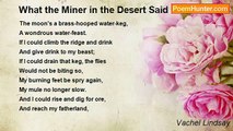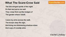 The moon is but a candle-glow <br />That flickers thro’ the gloom: <br />The starry space, a castle hall: <br />And Earth, the children’s room, <br />Where all night long the old trees stand <br />To watch the streams asleep: <br />Grandmothers guarding trundle-beds: <br />Good shepherds guarding sheep.<br /><br />Vachel Lindsay<br /><br />http://www.poemhunter.com/poem/what-the-forester-said/
