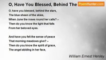 What have I done for you, <br />England, my England? <br />What is there I would not do, <br />England, my own? <br />With your glorious eyes austere, <br />As the Lord were walking near, <br />Whispering terrible things and dear <br />As the Song on your bugles blown, <br />England - <br />Round the world on your bugles blown! <br /> <br />Where shall the watchful Sun, <br />England, my England, <br />Match the master-work you've done, <br />England, my own? <br />When shall he rejoice agen <br />Such a breed of mighty men <br />As come forward, one to ten, <br />To the Song on your bugles blown, <br />England - <br />Down the years on your bugles blown? <br /> <br />Ever the faith endures, <br />England, my England:- <br />'Take and break us: we are yours, <br />'England, my own! <br />'Life is good, and joy runs high <br />'Between English earth and sky: <br />'Death is death; but we shall die <br />'To the Song on your bugles blown, <br />'England - <br />'To the stars on your bugles blown! <br /> <br />They call you proud and hard, <br />England, my England: <br />You with worlds to watch and ward, <br />England, my own! <br />You whose mailed hand keeps the keys <br />Of such teeming destinies <br />You could know nor dread nor ease <br />Were the Song on your bugles blown, <br />England, <br />Round the Pit on your bugles blown! <br /> <br />Mother of Ships whose might, <br />England, my England, <br />Is the fierce old Sea's delight, <br />England, my own, <br />Chosen daughter of the Lord, <br />Spouse-in-Chief of the ancient sword, <br />There's the menace of the Word <br />In the Song on your bugles blown, <br />England - <br />Out of heaven on your bugles blown!<br /><br />William Ernest Henley<br /><br />http://www.poemhunter.com/poem/what-have-i-done-for-you/