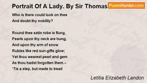 GATHER her raven hair in one rich cluster, <br />Let the white champac light it, as a star <br />Gives to the dusky night a sudden lustre, <br />Shining afar. <br /> <br />Shed fragrant oils upon her fragrant bosom, <br />Until the breathing air around grows sweet; <br />Scatter the languid jasmine's yellow blossom <br />Beneath her feet. <br /> <br />Those small white feet are bare—too soft are they <br />To tread on aught but flowers; and there is roll'd <br />Round the slight ankle, meet for such display, <br />The band of gold. <br /> <br />Chains and bright stones are on her arms and neck; <br />What pleasant vanities are linked with them, <br />Of happy hours, which youth delights to deck <br />With gold and gem. <br /> <br />She comes! So comes the Moon, when she has found <br />A silvery path wherein thro' heaven to glide. <br />Fling the white veil—a summer cloud—around; <br />She is a bride! <br /> <br />And yet the crowd that gather at her side <br />Are pale, and every gazer holds his breath. <br />Eyes fill with tears unbidden, for the bride— <br />The bride of Death! <br /> <br />She gives away the garland from her hair, <br />She gives the gems that she will wear no more; <br />All the affections, whose love-signs they were, <br />Are gone before. <br /> <br />The red pile blazes—let the bride ascend, <br />And lay her head upon her husband's heart, <br />Now in a perfect unison to blend— <br />No more to part.<br /><br />Letitia Elizabeth Landon<br /><br />http://www.poemhunter.com/poem/a-suttee/