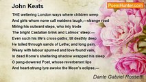 THROUGH one, years since hanged and forgot <br />Who stabbed backs by the Quarter, <br />Here lieth one who—while Time's stream <br />Runneth, as God hath taught her, <br />Bearing man's fame to men,—will have <br />His great name writ in water.<br /><br />Dante Gabriel Rossetti<br /><br />http://www.poemhunter.com/poem/an-epitaph-for-keats/