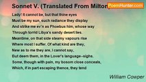 Naples, too credulous, ah! boast no more <br />The sweet-voiced Siren buried on thy shore, <br />That, when Parthenope deceas'd, she gave <br />Her sacred dust to a Chalcidic grave, <br />For still she lives, but has exchanged the hoarse <br />Pausilipo for Tiber's placid course, <br />Where, idol of all Rome, she now in chains, <br />Of magic song both Gods and Men detains.<br /><br />William Cowper<br /><br />http://www.poemhunter.com/poem/epigram-to-leonora-singing-at-rome-2-translated-from-milton/
