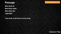Through the conduits of blood <br />my body in your body <br />spring of night <br />my tongue of sun in your forest <br />your body a kneading trough <br />I red wheat <br />Through conduits of bone <br />I night I water <br />I forest that moves forward <br />I tongue <br />I body <br />I sun-bone <br />Through the conduits of night <br />spring of bodies <br />You night of wheat <br />you forest in the sun <br />you waiting water <br />you kneading trough of bones <br />Through the conduits of sun <br />my night in your night <br />my sun in your sun <br />my wheat in your kneading trough <br />your forest in my tongue <br />Through the conduits of the body <br />water in the night <br />your body in my body <br />Spring of bones <br />Spring of suns<br /><br />Octavio Paz<br /><br />http://www.poemhunter.com/poem/axis-3/