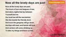 Now I've been three days <br />In the place where I am staying, <br />I've taken up new ways— <br />Land-owning and flute playing. <br />There's an orchard ground <br />Seen, that set me sighing. <br />Should I give ten pounds, <br />It is mine for the buying. <br />With the door set wide, <br />I could sit there playing, <br />Send the magic notes <br />Through the gully straying. <br />Since the roof is sound <br />And the trees are growing, <br />I will give ten pounds, <br />All my gold bestowing. <br />Now I've been three days <br />In the place where I am staying, <br />I've taken up new ways— <br />Land-owning and flute playing.<br /><br />Lesbia Harford<br /><br />http://www.poemhunter.com/poem/now-i-ve-been-three-days/