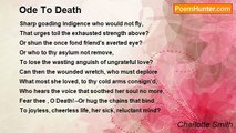 FROM THE NOVEL OF EMMELINE. <br />THOU spectre of terrific mien! <br />Lord of the hopeless heart and hollow eye, <br />In whose fierce train each form is seen <br />That drives sick Reason to insanity! <br />I woo thee with unusual prayer, <br />'Grim visaged, comfortless Despair:' <br />Approach; in me a willing victim find, <br />Who seeks thine iron sway--and calls thee kind! <br />Ah! hide for ever from my sight <br />The faithless flatterer Hope--whose pencil, gay, <br />Portrays some vision of delight, <br />Then bids the fairy tablet fade away; <br /> <br />While in dire contrast, to mine eyes, <br />Thy phantoms, yet more hideous, rise, <br />And Memory draws from Pleasure's wither'd flower, <br />Corrosives for the heart--of fatal power! <br />I bid the traitor Love adieu! <br />Who to this fond believing bosom came, <br />A guest insidious and untrue, <br />With Pity's soothing voice--in Friendship's name; <br />The wounds he gave, nor Time shall cure, <br />Nor Reason teach me to endure. <br />And to that breast mild Patience pleads in vain, <br />Which feels the curse--of meriting its pain. <br />Yet not to me, tremendous Power! <br />Thy worst of spirit-wounding pangs impart, <br />With which, in dark conviction's hour, <br />Thou strik'st the guilty unrepentant heart; <br />But of illusion long the sport, <br />That dreary, tranquil gloom I court, <br />Where my past errors I may still deplore, <br />And dream of long-lost happiness no more! <br />To thee I give this tortured breast, <br />Where Hope arises but to foster pain; <br />Ah! lull its agonies to rest! <br />Ah! let me never be deceived again! <br />But callous, in thy deep repose, <br />Behold, in long array, the woes <br />Of the dread future, calm and undismay'd, <br />Till I may claim the hope--that shall not fade!<br /><br />Charlotte Smith<br /><br />http://www.poemhunter.com/poem/ode-to-despair-2/