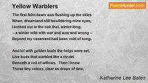 THESE August nights, hushed but for drowsy peep <br />Of fledglings, tremble with a strange vibration, <br />A sound too far for hearing, sullen, dire, <br />Shaking the earth. <br />Even within the swaying veils of sleep <br />We are haunted by a horror, a mistrust, <br />A muffled perturbation, <br />Vaguely aware <br />Of prodigies in birth, <br />Of brooding thunders unbelievable, <br />Fierce forces that conspire <br />Against mankind. <br />We start awake; <br />The purple glooms, all sweet <br />With dewy fragrance, bear <br />Our eyelids down, but still we feel the beat, <br />Dull, doomful, irretrievable, <br />Of Europe's marching feet, <br />Enchanted, blind, <br />By wizard music led <br />Over crushed blossoms, through the mocking dust, <br />To baths of blood and fire. <br />Beyond the seas, in these hushed hills we dread <br />That hollow, rhythmic tread <br />Of nation against nation, <br />That ancient, bitter thrust <br />Of war against a world that might be fair <br />As any golden star that rides the air. <br />We cannot rest for marching feet that must <br />Harvest and home forsake, <br />Inexorably called to take <br />The road of desolation, <br />Trampling on hearts that break.<br /><br />Katharine Lee Bates<br /><br />http://www.poemhunter.com/poem/marching-feet-2/