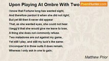 The amorous youth, whose tender breast <br />Was by his darling Cat possest, <br />Obtain'd of Venus his desire, <br />Howe'er irregular his fire: <br />Nature the power of love obey'd, <br />The Cat became a blushing maid, <br />And on the happy change the boy <br />Employ'd his wonder and his joy. <br />Take care, O beauteous child, take care, <br />Lest thou prefer so rash a prayer, <br />Nor vainly hope the queen of love, <br />Will e'er thy favourite's charms improve. <br />O quickly from her shrine retreat, <br />Or tremble for thy darling's fate. <br />The queen of love, who soon will see <br />Her own Adonis live in thee, <br />Will lightly her first loss deplore, <br />Will easily forgive the boar: <br />Her eyes with tears no more will flow, <br />With jealous rage her breast will glow, <br />And on her tabby rival's face <br />She deep will mark a new disgrace.<br /><br />Matthew Prior<br /><br />http://www.poemhunter.com/poem/to-my-lord-buckhurst-very-young-playing-with-a-cat/