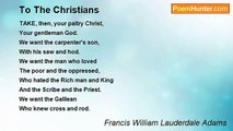 To a Workman, a would-be Suicide <br /> <br />MAN of despair and death, <br />Bought and slaved in the gangs, <br />Starved and stripped and left <br />To the pitiful, pitiless night, <br />Away with your selfish thoughts! <br />Touch not your ignorant life! <br />Are there no masters of slaves, <br />Jeering, cynical, strong — <br />Are there no brigands (say), <br />With the words of Christ on their lips, <br />And the daggers under their cloaks — <br />Is there not one of these <br />That you can steal on and kill? <br />O as the Swiss mountaineer <br />Dogged on the perilous heights <br />His disciplined conqueror foes: <br />Caught up one in his arms <br />And, laughing exultantly, <br />Plunged with him to the abyss: <br />So let it be with you! <br />An eye for an eye, and a tooth <br />For a tooth, and a life for a life! <br />Tell it, this hateful strong <br />Contemptuous, hypocrite World, <br />Tell it that, if we must live <br />As dogs and as worse than dogs, <br />At least we can die like men! <br />Tell it there is a woe <br />Not for the conquered alone! <br />An eye for an eye, and a tooth <br />For a tooth, and a life for a life.<br /><br />Francis William Lauderdale Adams<br /><br />http://www.poemhunter.com/poem/in-an-east-end-hovel/