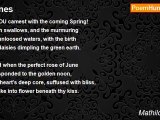 THOU camest with the coming Spring! <br />With swallows, and the murmuring <br />Of unloosed waters, with the birth <br />Of daisies dimpling the green earth. <br /> <br />And when the perfect rose of June <br />Responded to the golden noon, <br />My heart's deep core, suffused with bliss, <br />Broke into flower beneath thy kiss. <br /> <br />But now the swallows seaward fly, <br />The winds in chorus wail, 'Good-bye!' <br />The dead leaves whirl, and like a leaf <br />My heart shakes on the gusts of grief. <br /> <br />And yet awhile earth's flowerless breast <br />In lethal folds of snow will rest; <br />On thee too heart, with all thy woe, <br />Death falls one day like falling snow.<br /><br />Mathilde Blind<br /><br />http://www.poemhunter.com/poem/lines-ii/