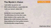 TRANSPORTED out of self by Youth's sweet madness, <br />Emulous of love, to Love's empyrean height, <br />Where I beheld you aureoled in light, <br />My soul upsprang on wings of angel-gladness. <br />Far, far below, the earth and all earth's badness-- <br />A speck of dust--slipped darkling into night, <br />As suns of fairer planets flamed in sight, <br />Pure orbs or bliss unstained by gloom or sadness. <br /> <br />Lo, as I soared etherially on high, <br />You vanished, from my swimming eyes aloof, <br />Alone, alone, within the empty sky, <br />I reached out giddily, and reeling fell <br />From starriest heaven, to plunge in lowest hell, <br />My proud heart broken on Earth's humblest roof.<br /><br />Mathilde Blind<br /><br />http://www.poemhunter.com/poem/love-s-vision/