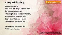 It was a sad, ay 'twas a sad farewell, <br />I still afresh the pangs of parting feel; <br />Against my breast my heart impatient beat, <br />And in deep sighs bemoan'd its cruel fate; <br />Thus with the object of my love to part, <br />My life! my joy! 'twould rend a rocky heart. <br />Where'er I turn myself, where'er I go, <br />I meet the image of my lovely foe; <br />With witching charms the phantom still appears, <br />And with her wanton smiles insults my tears; <br />Still haunts the places where we used to walk, <br />And where with raptures oft I heard her talk: <br />Those scenes I now with deepest sorrow view, <br />And sighing bid to all delight adieu. <br />While I my head upon this turf recline, <br />Officious sun, in vain on me you shine; <br />In vain unto the smiling fields I hie; <br />In vain the flowery meads salute my eye; <br />In vain the cheerful birds and shepherds sing, <br />And with their carols make the valleys ring; <br />Yea, all the pleasure that the country yield <br />Can't me from sorrow for her absence shield; <br />With divine pleasure books which one inspire, <br />Yea, books themselves I do not now admire. <br />But hark! methinks some pitying power I hear, <br />This welcome message whisper in my ear: <br />‘Forget thy groundless griefs, dejected swain, <br />You and the nymph you love shall meet again; <br />No more your muse shall sing such mournful lays, <br />But bounteous heaven and your kind mistress praise.’<br /><br />James Thomson<br /><br />http://www.poemhunter.com/poem/an-elegy-on-parting/