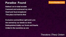 Alibaster sands glisten-- <br />'Neath the Suns tropic cover- <br />A canopy for romance... <br />A hidden hideaway for lovers; <br /> <br />Palm trees-they tower... <br />As if reaching for the sky-- <br />They are umbrellas of privacy--- <br />For you and for i; <br /> <br />Balmy breezes of the Carribean- <br />Cool down our sweltering night... <br />Easing us comfortably- <br />Into raptures conjugal delight; <br /> <br />Its a perfect recipe for lovers... <br />A gift for renewel of bliss... <br />Its an enchanted island-- <br />Thats sealed with our kiss; <br /> <br />May 19,2010 <br />The Essence<br /><br />Theodora (Theo) Onken<br /><br />http://www.poemhunter.com/poem/paradise-66/