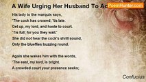 The dolichos grows and covers the thorn, <br />O'er the waste is the dragon-plant creeping. <br />The man of my heart is away and I mourn-- <br />What home have I, lonely and weeping? <br /> <br />Covering the jujubes the dolichos grows, <br />The graves many dragon-plants cover; <br />But where is the man on whose breast I'd repose? <br />No home have I, having no lover! <br /> <br />Fair to see was the pillow of horn, <br />And fair the bed-chamber's adorning; <br />But the man of my heart is not here, and I mourn <br />All alone, and wait for the morning. <br /> <br />While the long days of summer pass over my head, <br />And long winter nights leave their traces, <br />I'm alone! Till a hundred of years shall have fled, <br />And then I shall meet his embraces. <br /> <br />Through the long winter nights I am burdened with fears, <br />Through the long summer days I am lonely; <br />But when time shall have counted its hundreds of years <br />I then shall be his--and his only!<br /><br />Confucius<br /><br />http://www.poemhunter.com/poem/a-wife-mourns-for-her-husband-2/
