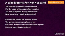 His lady to the marquis says, <br />'The cock has crowed; 'tis late. <br />Get up, my lord, and haste to court. <br />'Tis full; for you they wait.' <br />She did not hear the cock's shrill sound, <br />Only the blueflies buzzing round. <br /> <br />Again she wakes him with the words, <br />'The east, my lord, is bright. <br />A crowded court your presence seeks; <br />Get up and hail the light.' <br />'Twas not the dawning light which shone, <br />But that which by the moon was thrown. <br /> <br />He sleeping still, once more she says, <br />'The flies are buzzing loud. <br />To lie and dream here by your side <br />Were pleasant, but the crowd <br />Of officers will soon retire; <br />Draw not on you and me their ire!'<br /><br />Confucius<br /><br />http://www.poemhunter.com/poem/a-wife-urging-her-husband-to-action/