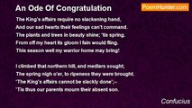 The dew lies heavy all around, <br />Nor, till the sun shines, leaves the ground. <br />Far into night we feasting sit; <br />We drink, and none his place may quit. <br /> <br />The dew lies heavy, and its gems <br />Stud the luxuriant, grassy stems. <br />The happy night with wassail rings; <br />So feasted here the former kings. <br /> <br />The jujube and the willow-tree <br />All fretted with the dew we see. <br />Each guest's a prince of noble line, <br />In whom the virtues all combine. <br /> <br />The _t'ung_ and _e_ their fruits display, <br />Pendant from every graceful spray. <br />My guests are joyous and serene, <br />No haggard eye, no ruffled mien.<br /><br />Confucius<br /><br />http://www.poemhunter.com/poem/an-ode-appropriate-to-a-festivity/