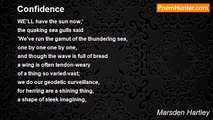 WHEN the surf licks with its tongues <br />these volcanic personal shapes, which we, <br />defining for ourselves as rocks, accept <br />them as such, at its feverish incoming <br />isn't it too, in its way, something like <br />the plain image of life? <br />Those restless entities disturbing solid <br />substances with a curious, irrelevant, <br />common fret <br />and, like so many simple looking elements, when <br />they seem the most playful, it is then that <br />they are most dangerous. <br />The bright woman looking out to sea <br />through the crisp telescope of her advancing <br />years, <br />there is no doubt but that she discovers the <br />same image as the child, who remarks the <br />radiant glint of his marbles on the top spray <br />of the wave he once played with, <br />or as the fringed lace on the dress of a <br />Titan's wife <br />the inwash cooling at least the eye with <br />a something exceptional white or green or <br />blue, too pale almost to mention, if <br />frightening to the marrow, <br />for many have been sent to their death trusting <br />too much while regarding it affectionately, <br />the sea.<br /><br />Marsden Hartley<br /><br />http://www.poemhunter.com/poem/indian-point/