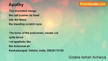 Wherever the body is <br /> ‘I’ get up hidden <br /> run, fly or float <br />somewhere other I am. <br /> <br />From inside the knot; <br /> the neck spits at a giraffe <br />eyes telescope <br />greed zooms in <br /> I suck a lot many things <br /> you never see; can’t see at all. <br /> <br />Envy the neighbor <br /> kill the Alexanders <br />rape the virgins or a Cleophile <br /> and philosophize <br />shinning like the sun. <br />Where you’re; there my body is <br />where you’re; I am not there; <br />I sit somewhere <br /> like a God <br />away from all. <br />I stand somewhere <br /> <br />1-04-2009 Keshadurapal<br /><br />Golaka behari Acharya<br /><br />http://www.poemhunter.com/poem/a-demon-or-a-god/
