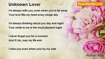 You dont show it always <br />but I know that you care. <br /> <br />Your My unknown friend <br />If i ever need you, I know you'd be there. <br /> <br />I'm glad you're my friend. <br />And will stay this way till the very end <br /> <br />My smile makes you smile <br />My pain makes you sad <br /> <br />Sometimes you make me happy <br />Sometimes you make me mad <br /> <br />You and I are different <br />And in many ways the same <br /> <br />Your good ear, compassionate heart, <br />will always find you fame <br /> <br />The more I get to know you <br />The more I know myself <br /> <br />As long as we are together <br />Happiness is going to come itself<br /><br />Rohan Roy<br /><br />http://www.poemhunter.com/poem/ode-to-an-unknown-friend/