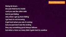 You were supposed to be there, <br />You we supposed to take care of me, <br />You were supposed to make me feel safe. <br /> <br />I was supposed to count on you, <br />I was supposed to believe you, <br />I was supposed to have trust and faith in you. <br /> <br />Instead I you were never there, <br />You never took care of me, <br />You never made me feel like I was safe. <br /> <br />I always counted on you, <br />Then you failed me, <br />I always believe you, <br />But they were all lies, <br />I had trust and faith in you, <br />And you let me down.. <br /> <br />I needed you, <br />But I don’t trust you, <br />So I don’t need you anymore,<br /><br />Carrie Salazar<br /><br />http://www.poemhunter.com/poem/being-let-down-2/