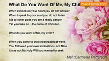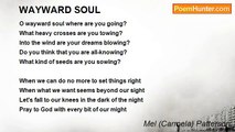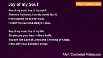 The soul is a prism reflecting the Light <br />The radiance of which blinds our sight <br />A soul so attuned soars to great height. <br /> <br />The soul nearing the the Lord is lighter <br />And the closer to Him the brighter <br />Imaging Him it is even whiter. <br /> <br />God draws a beloved soul to His own <br />His Soul and the small soul coo in a moan. <br /> <br /> The soul caught up in shameful sins <br />Moves away from God; satan wins ~ <br />But God's love for that prodical son <br /> Through the Blood of the Cross has won <br />The repentent soul and washed away <br />The filthy stain of blackness and gray. <br /> <br />God draws this soul close to His Heart <br />He blesses it by giving it a fresh start <br />He enlivens and enlightens the soul to pray <br />To ask for graces sufficient for the day. <br /> <br />The soul nearing the the Lord is lighter <br />And the closer to Him the brighter <br />Imaging Him it is even whiter. <br /> <br /> <br /> <br /> © Mel Patterson,1-16-11<br /><br />Carmela Patterson<br /><br />http://www.poemhunter.com/poem/what-color-is-the-soul/