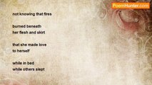 He loves to watch her sleep. <br />Likes to hear her breathe in <br />And out; see her breasts rise <br />And fall like sleeping giants. <br /> <br />He likes how she exudes a <br />Sense of peacefulness as if <br />Angels touched her brow and <br />Breathed a deeper love somehow. <br /> <br />He loves how her red lips move <br />In silent conversation, how now <br />And then her tongue brushes her <br />Lower lip with moisture of saliva. <br /> <br />Should he wake her from deep sleep? <br />Ought he to kiss her lips and bring <br />Her from sleep’s warm hold? Should <br />He touch her limbs with lust to life? <br /> <br />No, no, don’t wake her from her sleep, <br />Too dangerous; for although he is her <br />Lover, she’s his busy boss’s pretty wife.<br /><br />Terry Collett<br /><br />http://www.poemhunter.com/poem/watching-her-sleep/