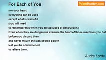 Coming together <br />it is easier to work <br />after our bodies <br />meet <br />paper and pen <br />neither care nor profit <br />whether we write or not <br />but as your body moves <br />under my hands <br />charged and waiting <br />we cut the leash <br />you create me against your thighs <br />hilly with images <br />moving through our word countries <br />my body <br />writes into your flesh <br />the poem <br />you make of me. <br /> <br />Touching you I catch midnight <br />as moon fires set in my throat <br />I love you flesh into blossom <br />I made you <br />and take you made <br />into me.<br /><br />Audre Lorde<br /><br />http://www.poemhunter.com/poem/recreation-6/