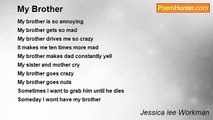 My brother is so annoying <br />My brother gets so mad <br />My brother drives me so crazy <br />It makes me ten times more mad <br />My brother makes dad constantly yell <br />My sister and mother cry <br />My brother goes crazy <br />My brother goes nuts <br />Sometimes I want to grab him until he dies <br />Someday I wont have my brother <br />I wish that day will never come <br />But he will fight me <br />But I know that shows a lot of love sometime I cry to show our love<br /><br />Jessica Lee Workman<br /><br />http://www.poemhunter.com/poem/my-brother-65/