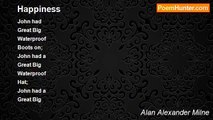 Christopher Robin <br /> Had wheezles <br /> And sneezles, <br /> They bundled him <br /> Into <br /> His bed. <br /> They gave him what goes <br /> With a cold in the nose, <br /> And some more for a cold <br /> In the head. <br /> They wondered <br /> If wheezles <br /> Could turn <br /> Into measles, <br /> If sneezles <br /> Would turn <br /> Into mumps; <br /> The examined his chest <br /> For a rash, <br /> and the rest <br /> Of his body for swellings and lumps. <br /> They sent for some doctors <br /> In sneezles <br /> And wheezles <br /> To tell them what ought <br /> To be done. <br /> <br /> All sorts of conditions <br /> Of famous physicians <br /> Came hurrying round <br /> At a run. <br /> They all made a note <br /> Of the state of his throat, <br /> They asked if he suffered from thirst; <br /> They asked if the sneezles <br /> Came after the wheezles, <br /> Or if the first sneezle <br /> Came first. <br /> They said, “If you teazle <br /> A sneezle <br /> Or wheezle, <br /> A measle <br /> May easily grow. <br /> But humour or pleazle <br /> The wheezle <br /> Or sneezle, <br /> The measle <br /> Will certainly go.” <br /> They expounded the reazles <br /> For sneezles <br /> And wheezles, <br /> The manner of measles <br /> When new. <br /> They said, “If he freezles <br /> In draughts and in breezles, <br /> Then PHTHEEZLES <br /> May even ensue.” <br /> <br />Christopher Robin <br />Got up in the morning, <br />The sneezles had vanished away. <br />And the look in his eye <br />Seemed to say to the sky, <br />“Now, how to amuse them today?”<br /><br />Alan Alexander Milne<br /><br />http://www.poemhunter.com/poem/sneezles/