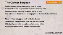 Today I met a man who thought that he was truly dying <br />This brush with his mortality had left him lost and crying <br />He never really understood how fragile life can be <br />And now his hopes and desperation focused square on me <br /> <br />I had a kindly conversation with him and his wife <br />I guaranteed that I would do my best to save his life <br />I reassured him that this tumor might still be benign <br />If not we hoped that we had caught it in the nick of time <br /> <br />Next day I gave him his good news that it was nothing bad <br />He and his wife were quite relieved and yet they both seemed sad <br />They looked back at their lives and saw so many wasted years <br />They smoked too much and drank too much and cried too many tears <br /> <br />That day that he thought he was gone was really quite a gift <br />It made him see that up ‘til then his life was just adrift <br />Although I never had to work a wonder with a knife <br />That day was not forgotten and in fact it saved his life.<br /><br />Richard Lackman<br /><br />http://www.poemhunter.com/poem/almost-cancer/