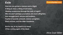 THE rustling palms bend readily <br />Between the sun and me; <br />The trades blow warm and steadily <br />Across the turquoise sea; <br />But I'd rather feel the March wind bite <br />In the country of the free. <br /> <br />Hibiscus and camellias <br />Bloom here abundantly, <br />And roses and gardenias <br />The sweetest flowers there be <br />But I'd rather see through the bare north woods <br />One bridal dogwood tree. <br /> <br />The tropic light is mellow <br />As a lamp in a lighted room; <br />The sun shines high and yellow <br />In the quivering cloudless dome; <br />But, oh, for the snow and the cruel cold <br />And the rigors of my home!<br /><br />Alice Duer Miller<br /><br />http://www.poemhunter.com/poem/song-in-exile/